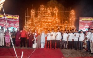 Bupati Kasmarni secara simbolis menghidupkan lampu colok dengan ornamen masjid, yang dipusatkan di Jalan Stadion, tepatnya di area pembangunan Masjid Wakaf Al-Fahruddin, Kelurahan Air Jamban, Kecamatan Mandau ini.