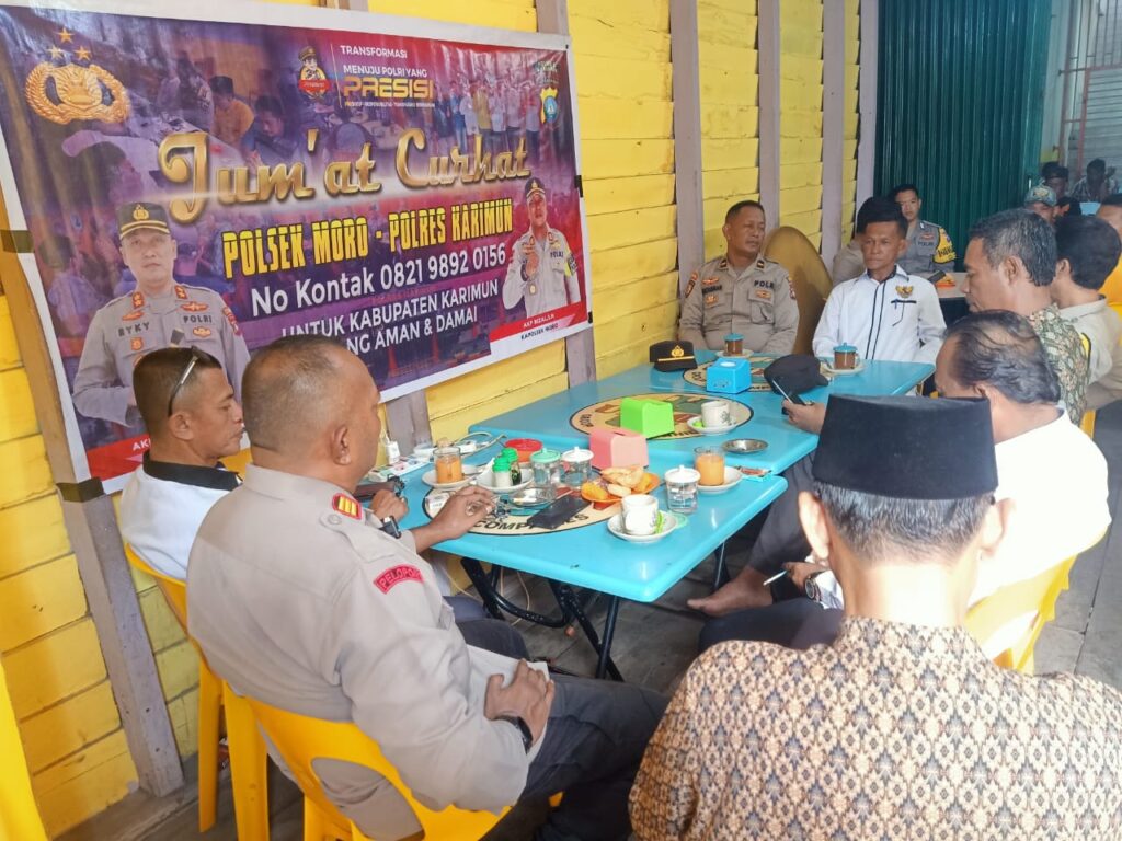 KARIMUN,sempenanews.com-Dalam rangka menjalin komunikasi dan silahturahmi kepada masyarakat nelayan di Kecamatan Moro, Polsek Moro melaksanakan kegiatan jumat curhat yang di pimpin langsung oleh Kapolsek Moro AKP Rizal Rahim, S.H. menyambangi langsung masyarakat Moro di kedai kopi Mantul Jl. Jend. Sudirman, Kp. Tengah Timur, Kel. Moro Timur, Kec. Moro, Kab. Karimun. Pada Jum’at (29/09/2023)
