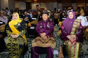 Bupati Kasmarni hadir bersama sejumlah Kepala Daerah lainnya mengenakan baju adat Kurung Melayu berwarna hitam dan disandangkan dengan kain songket berwarna kuning.