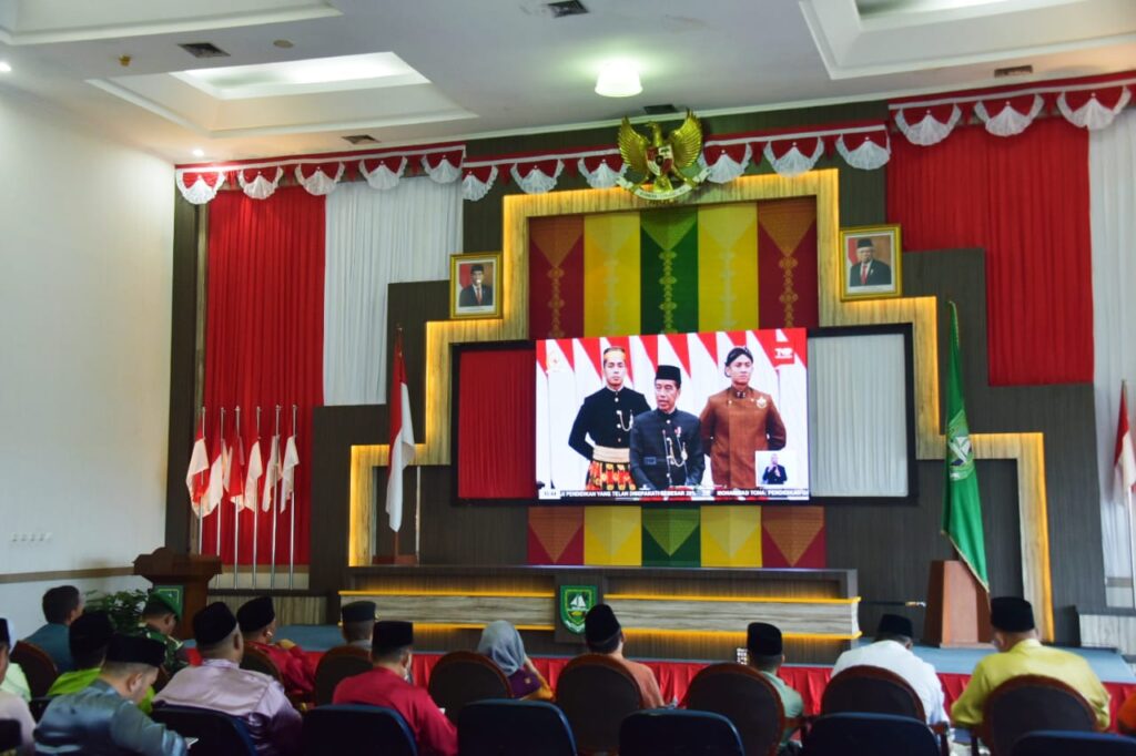 BENGKALIS,sempenanews.com – Bupati Bengkalis Kasmarni diwakili Wakil Bupati Bengkalis H. Bagus Santoso mendengarkan isi pidato kenegaraan yang disampaikan Presiden Republik Indonesia Joko Widodo secara daring. Jum’at 16 Agustus 2024, di ruang Dang Merdu lantai IV Kantor Bupati Bengkalis.
